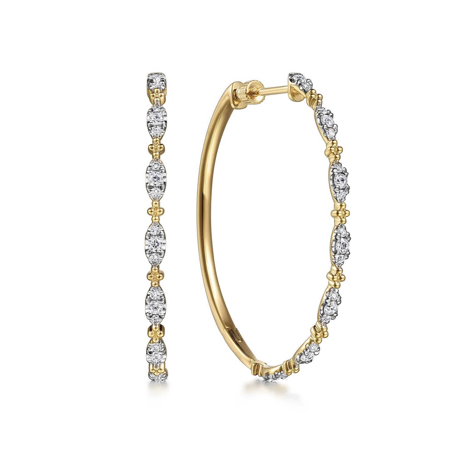 14K Yellow Gold Diamond Intricate Hoop Earrings.
